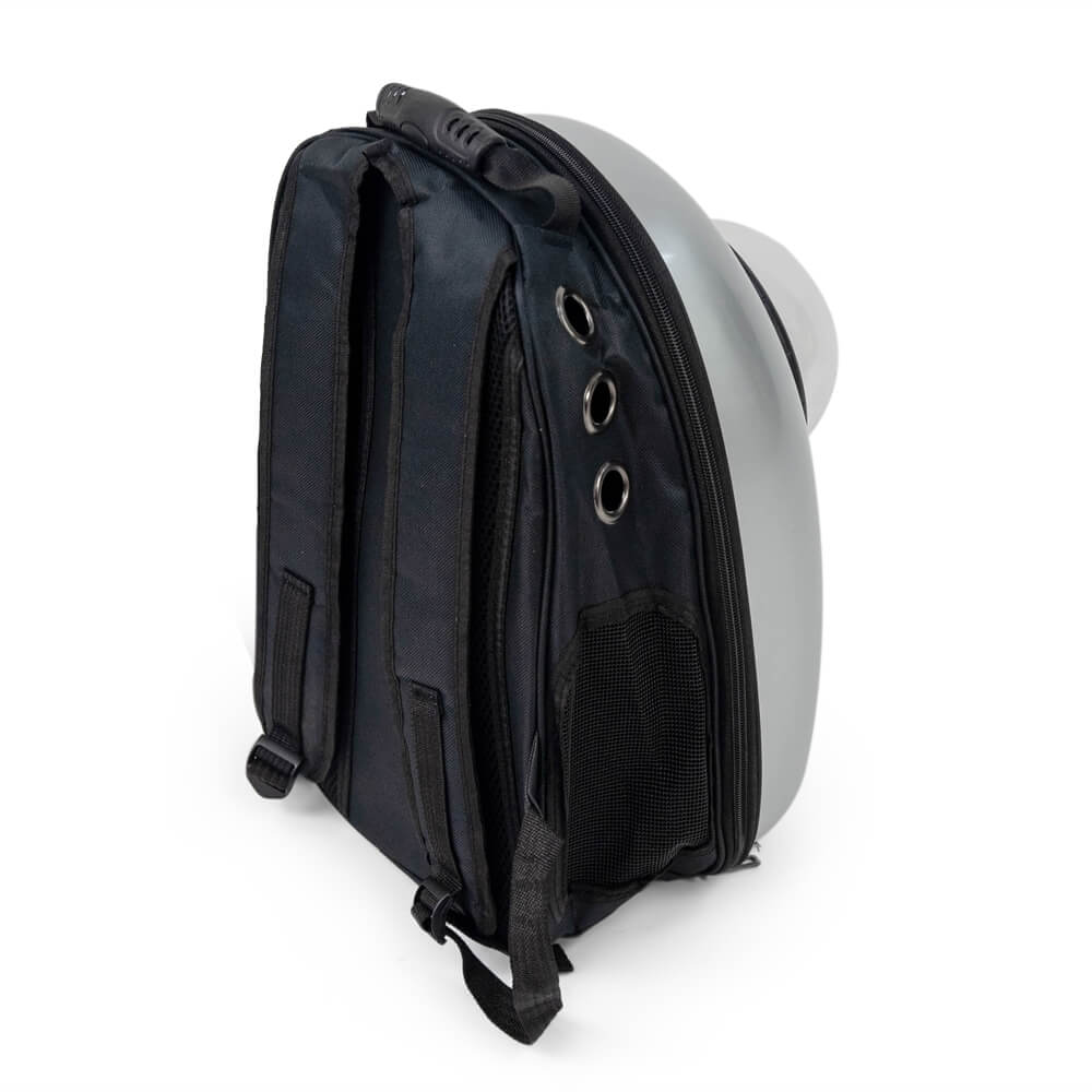 Рюкзак из прочного поликарбоната для переноски кошек и небольших собак. Круговой замок молния обеспечивает полное раскрытие рюкзака. На боковых поверхностях имеются сетчатые окошки для вентиляции. Сферический иллюминатор на крышке рюкзака обеспечивает достаточную освещенность и позволяет визуально контролировать состояние животного.